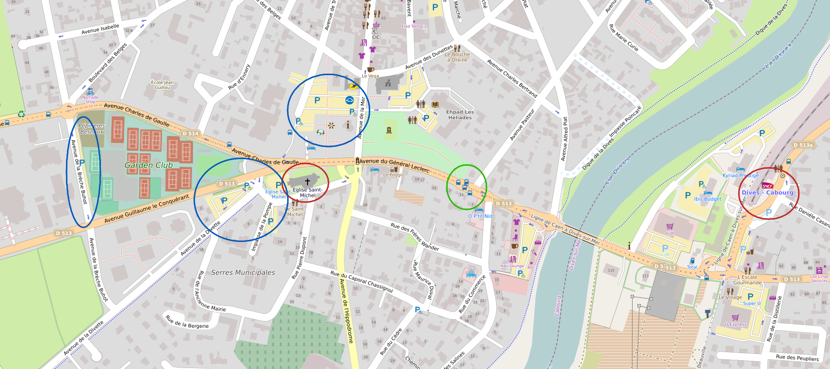 En rouge : l’église et la gare : en vert : l’arrêt de bus depuis Caen ; en bleu : les parkings autour de l’église